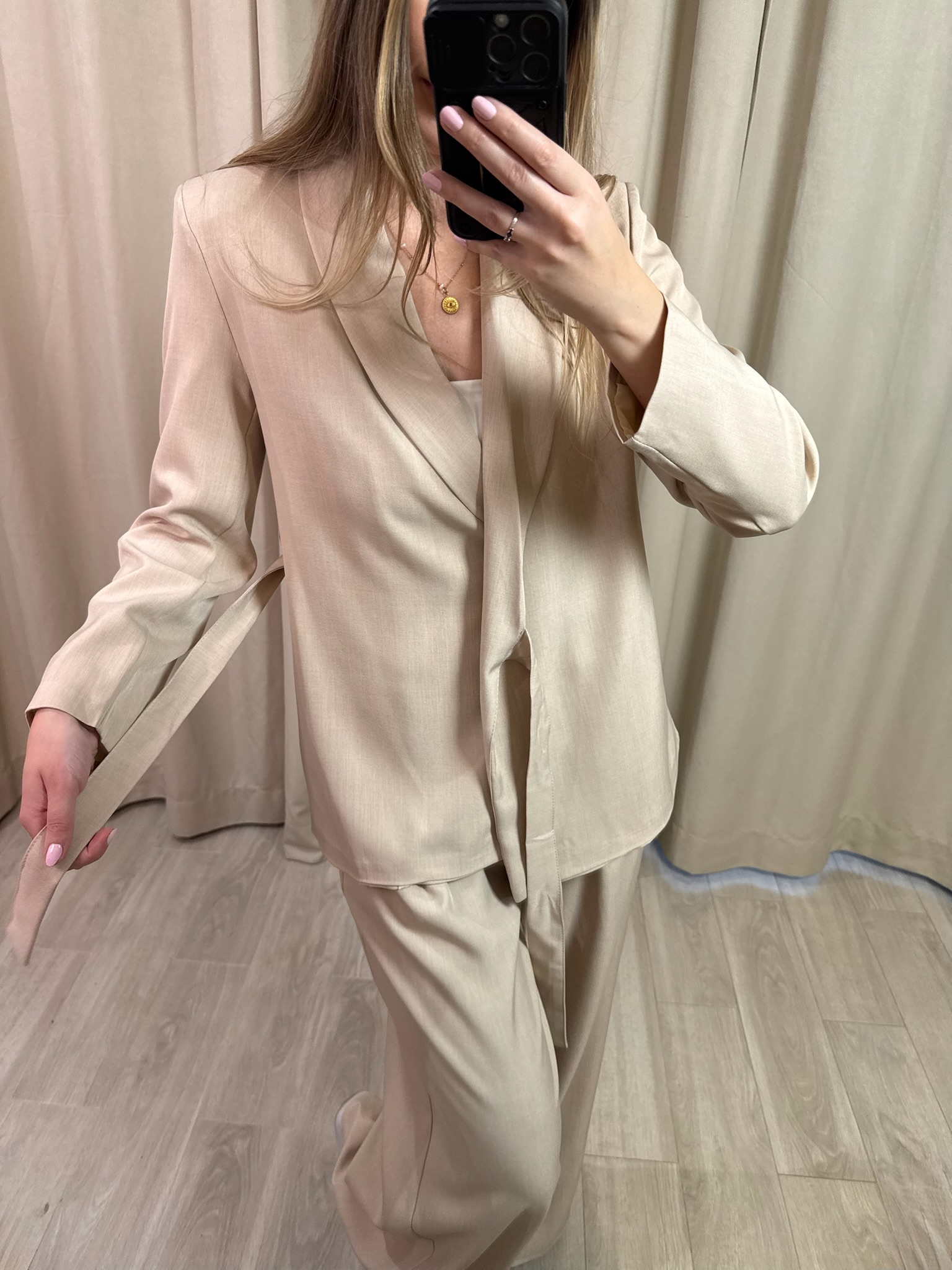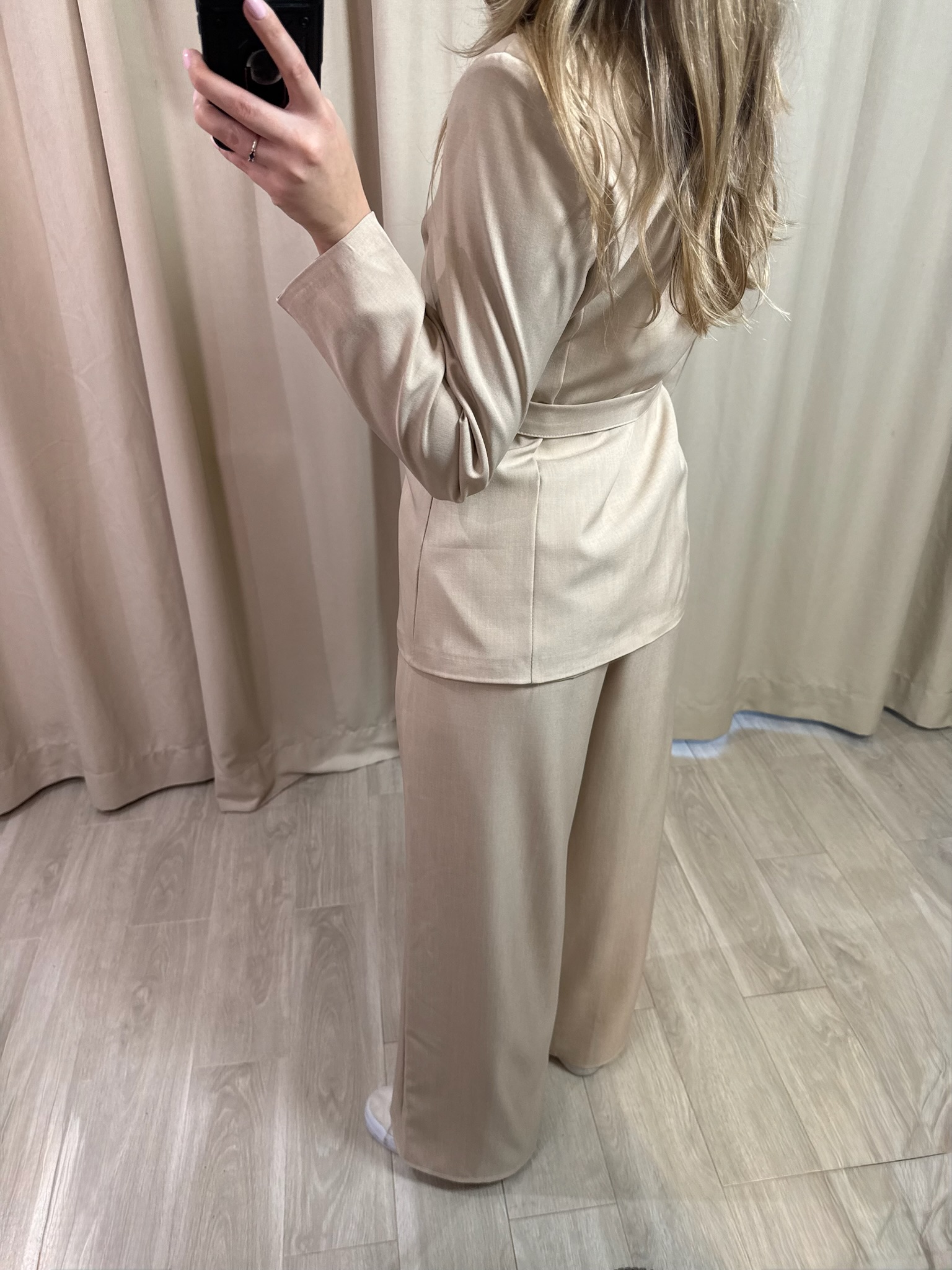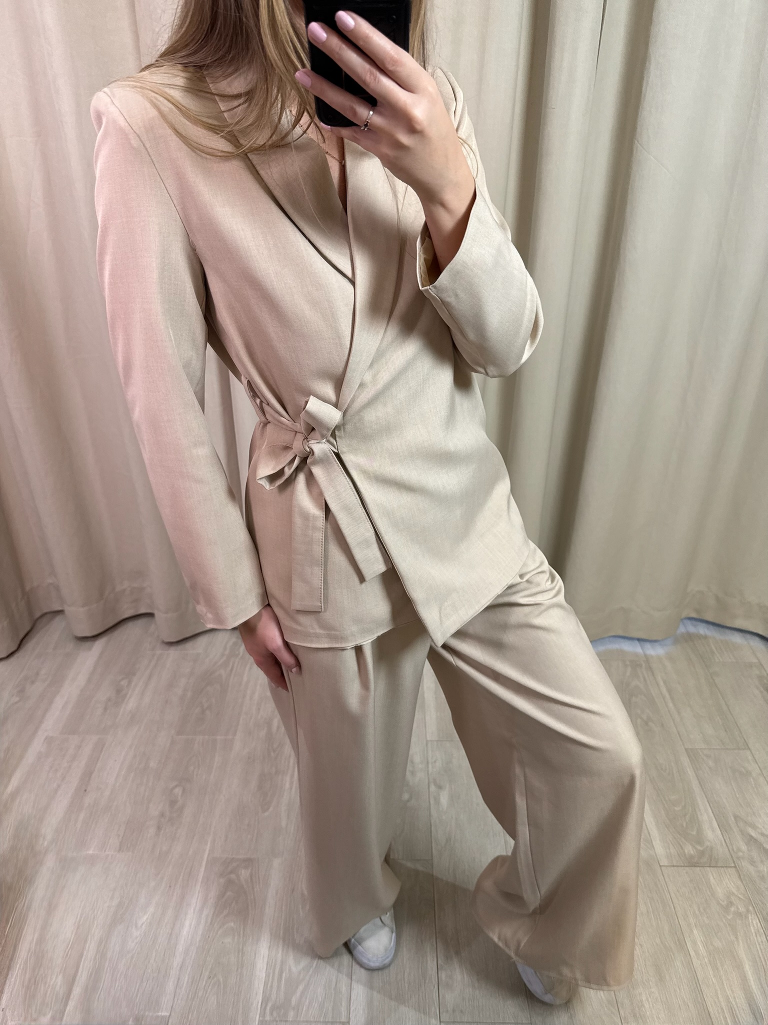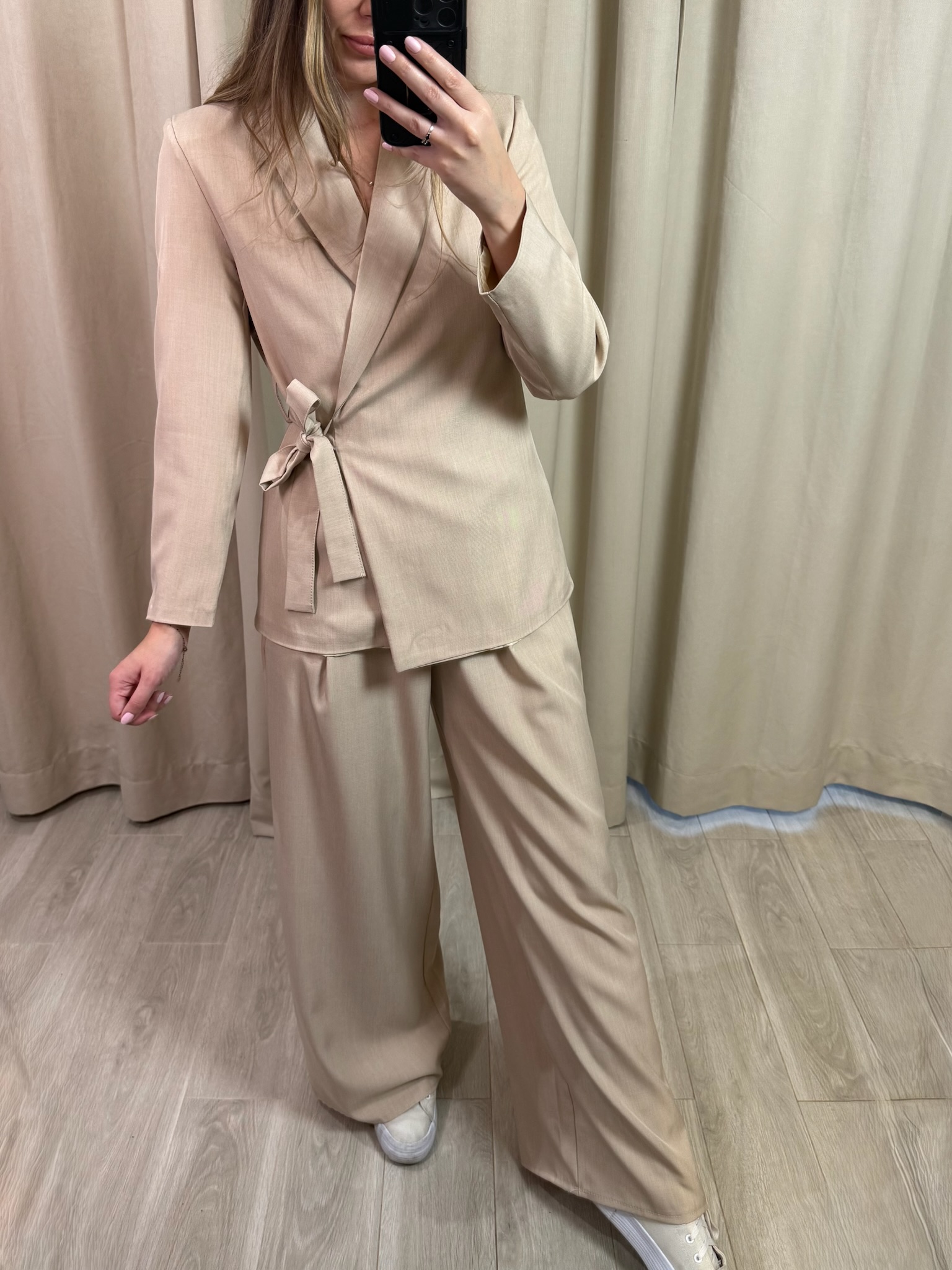 Elegancki komplet "Classe", składający się ze stylowej marynarki wiązanej dookoła talii i spodni typu wide leg z kieszeniami, gumką w pasie. Idealny na różnego rodzaju uroczystości, spotkania, czy również do pracy. Esencja elegancji i stylu.