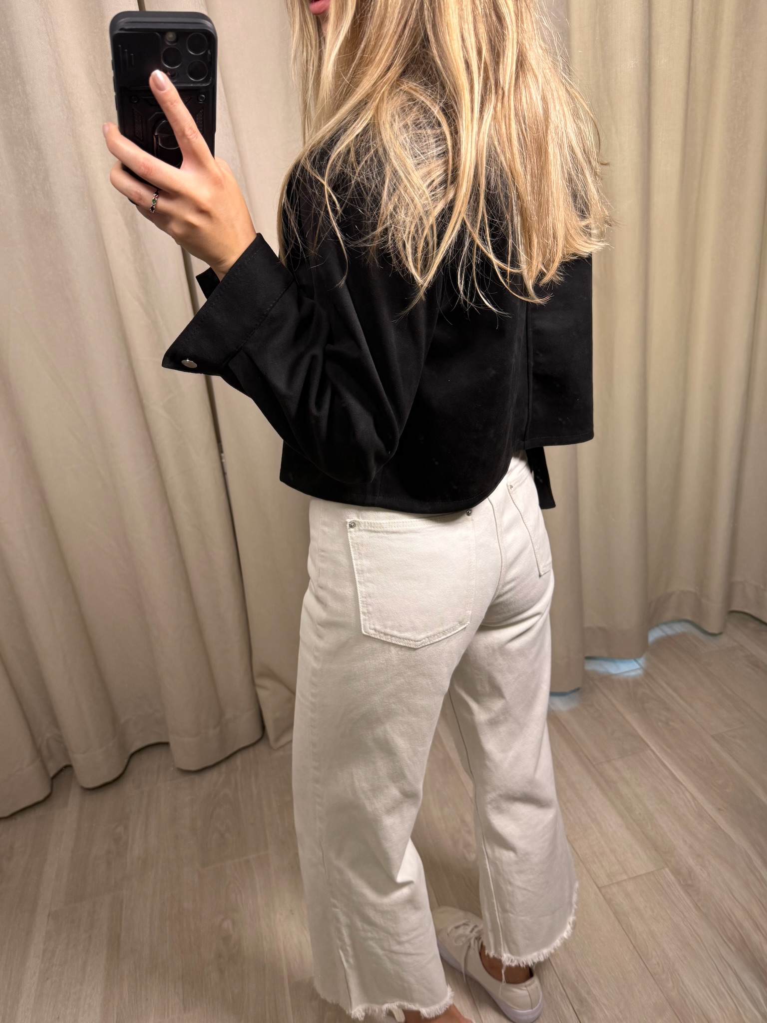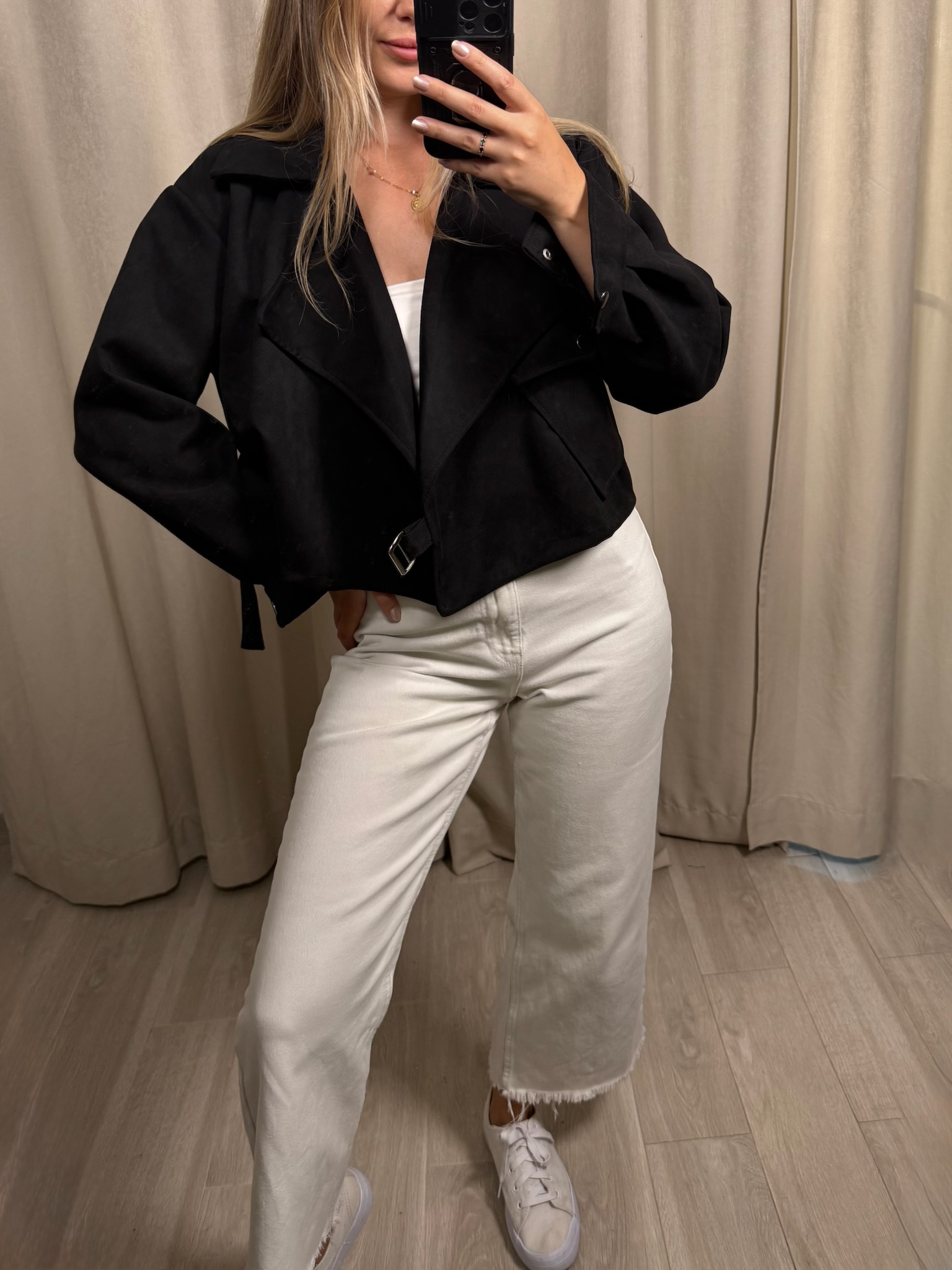 Kurtka "Dikdik" w kolorze czarnym. Cienki i miękki materiał sprawi, że poczujesz się w niej komfortowo, w sam raz na początek naszej pięknej polskiej jesieni. Rękawy zapinane na napy - łatwo i szybko będziesz mogła je odpiąć i podwinąć, aby ją wystylizować. Kurtka zapinana od boku na klamrę - dopasujesz ją do swojej sylwetki. Posiada również jedną, dużą, praktyczną kieszeń.