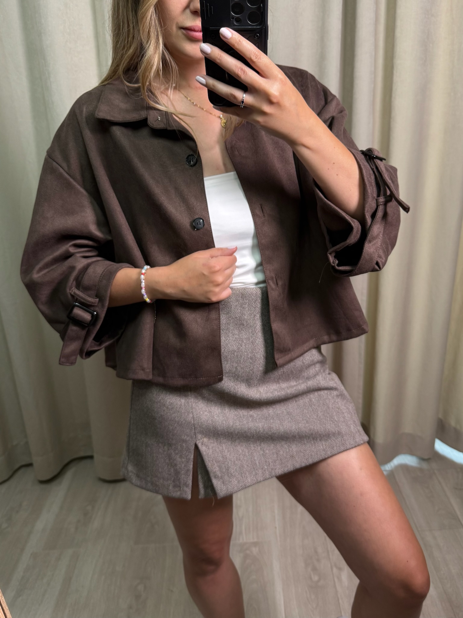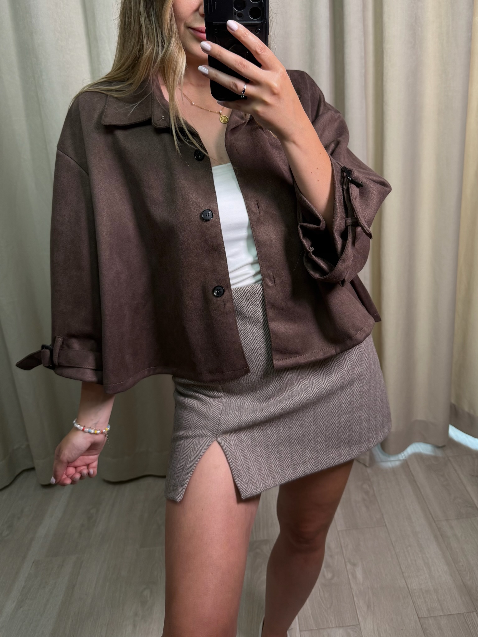 Kurtka "Za Mszowe" z modnego Eco zamszu w kolorze czekolady. Zapinana na guziki, kołnierzyk i ciekawy wariant z delikatnie krótszym rękawkiem to powiew ciekawego stylu i elegancji. Świetna na tegoroczne lato, które nie rozpieszcza jak i również wczesną jesień.