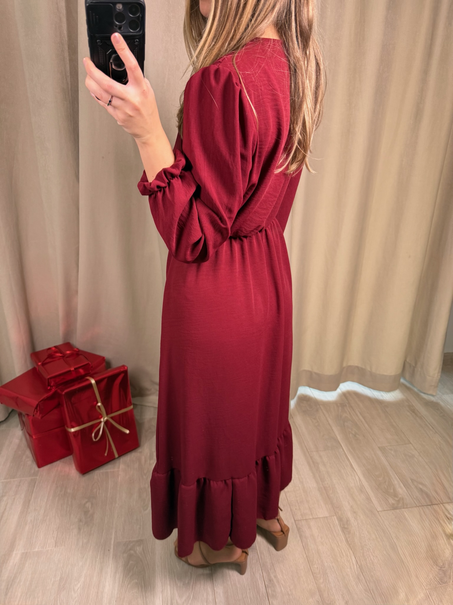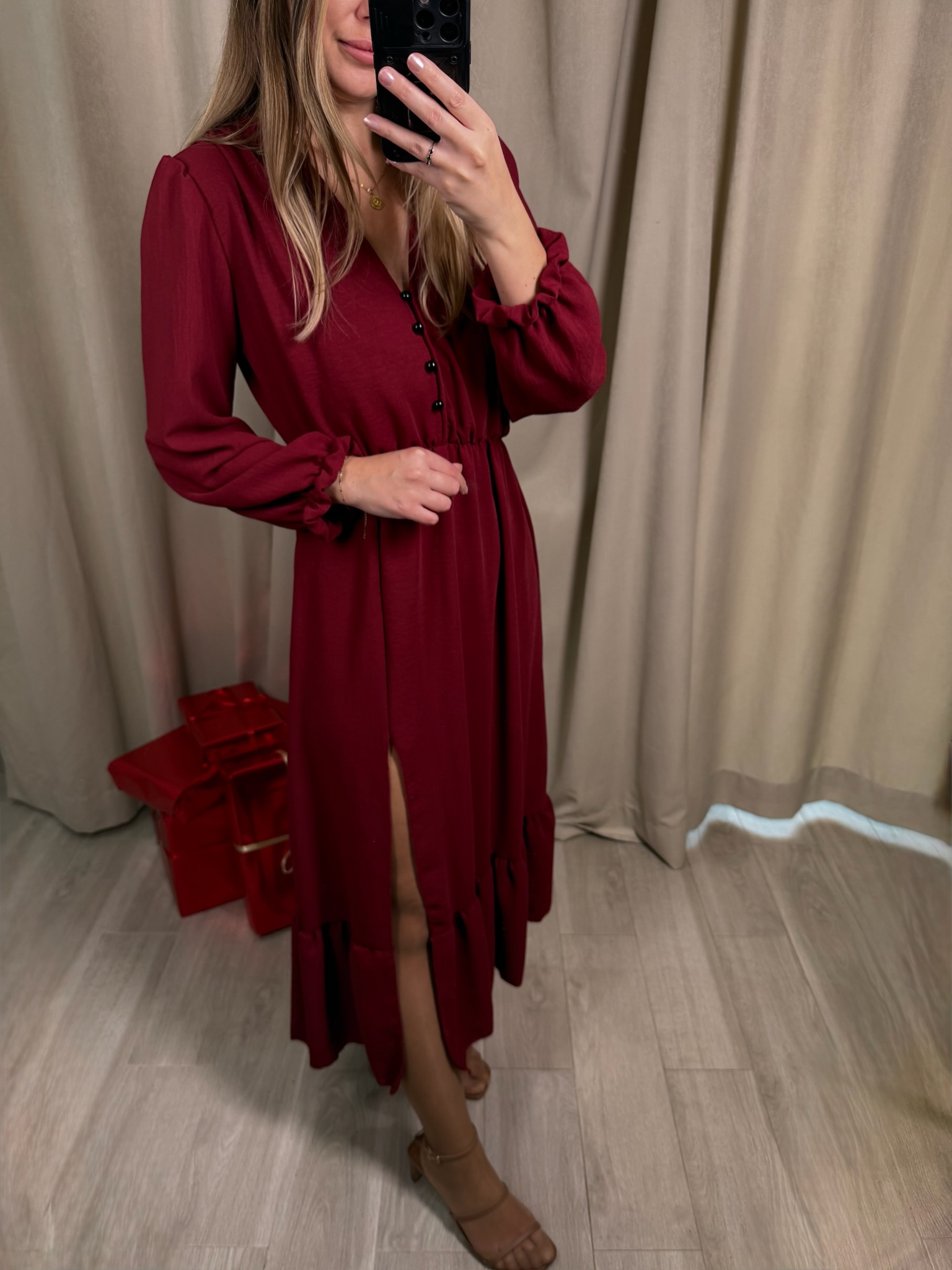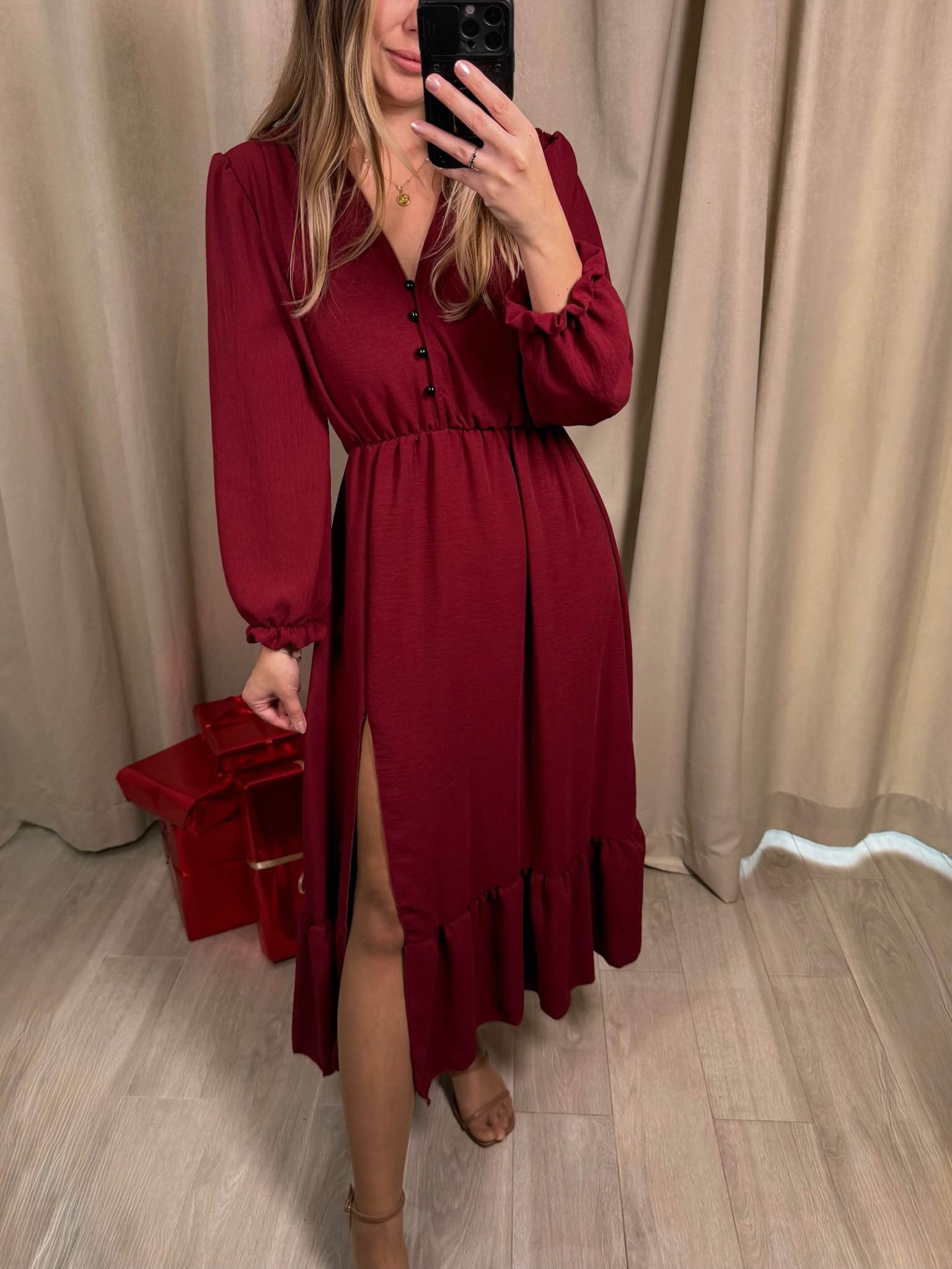 Elegancka sukienka Chiari midi, o ponadczasowym fasonem. Dekolt w kształcie litery V pięknie podkreśla szyję i wysmukla sylwetkę, a ozdobne guziki ala perełki dodają całości subtelnej elegancji. Elastyczna gumka w talii zapewnia idealne dopasowanie i komfort noszenia. Długie rękawy zakończone delikatną gumką nadają sukience lekkości i sprawiają, że doskonale sprawdzi się zarówno na co dzień, jak i na bardziej wyjątkowe okazje.