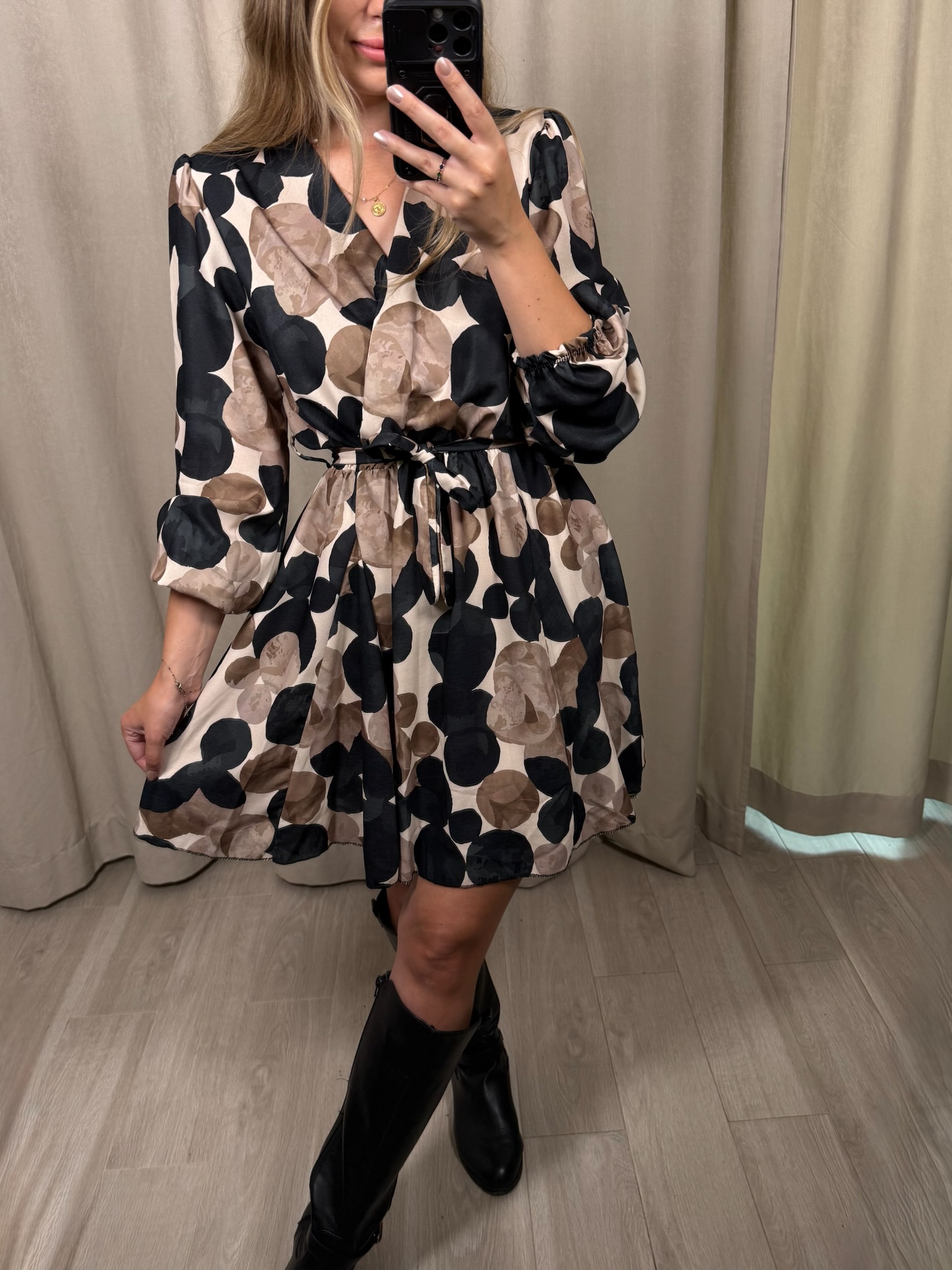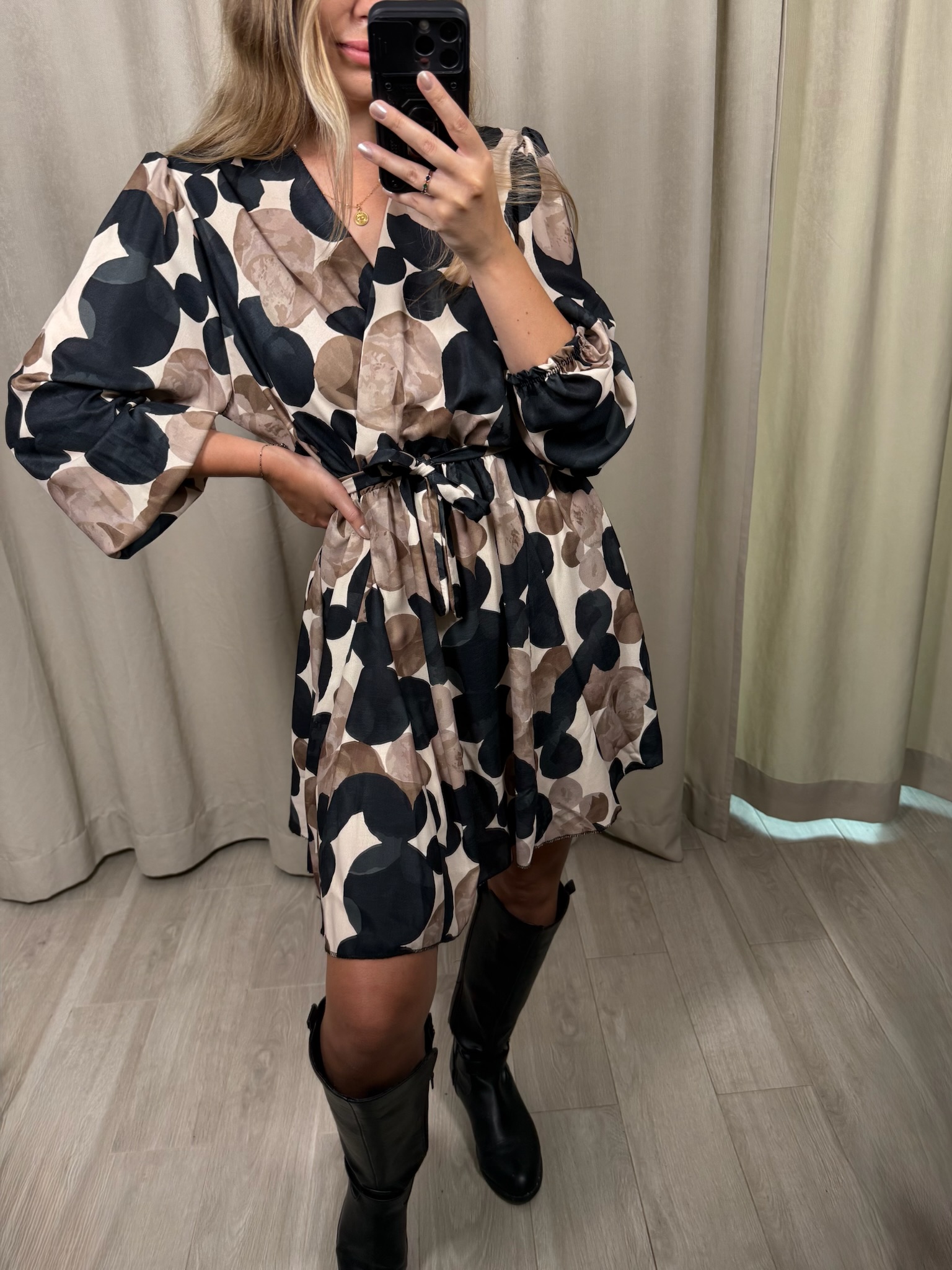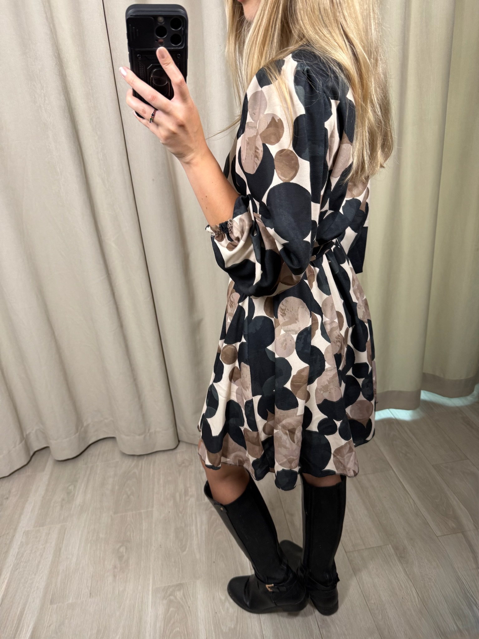 Sukienka "Impala" w kółka, to wybór na zbliżającą się jesień. Kopertowy dekolt jak i rozkloszowane biodra sprawiają, że możesz poczuć się w niej luźno i swobodnie. Natomiast gumka i pasek w talii, pozwoli Ci ją dopasować do Twojej figury.