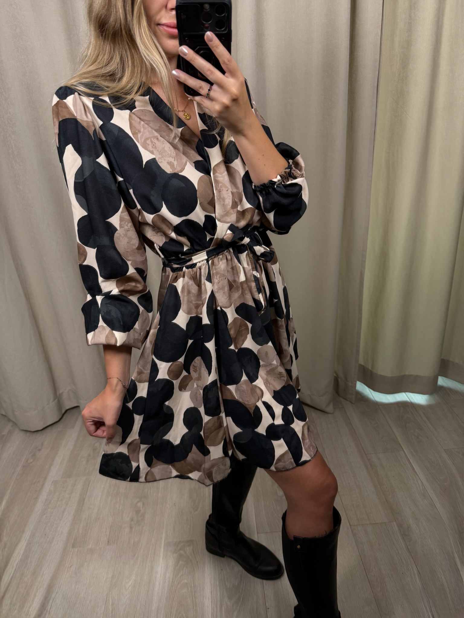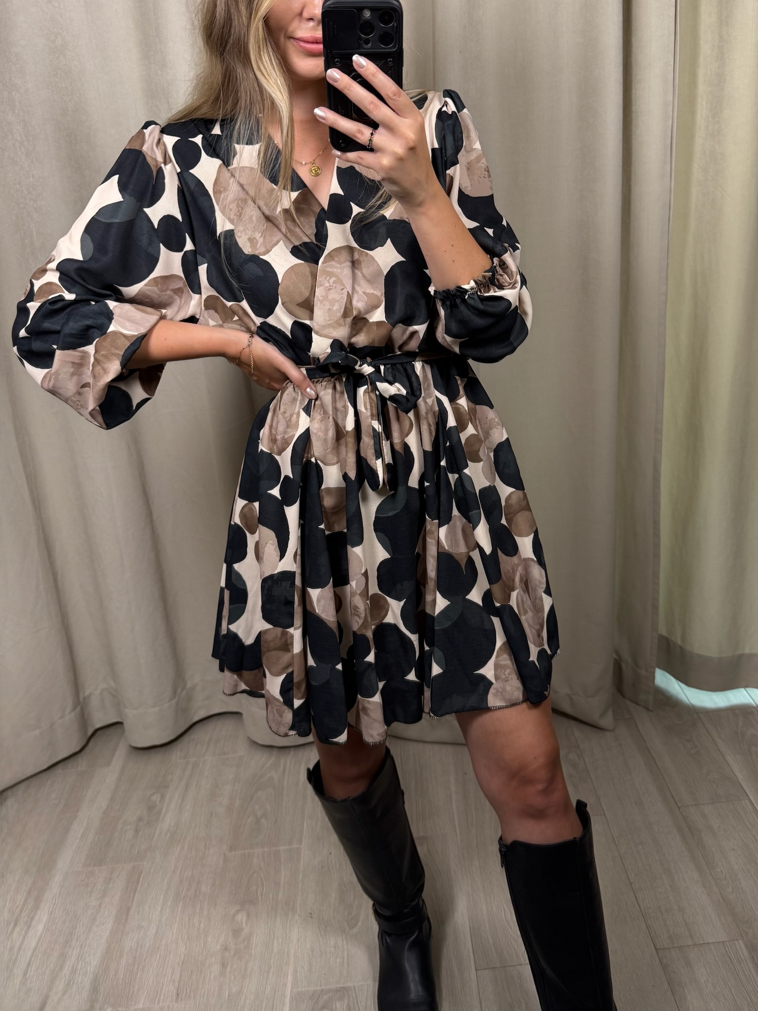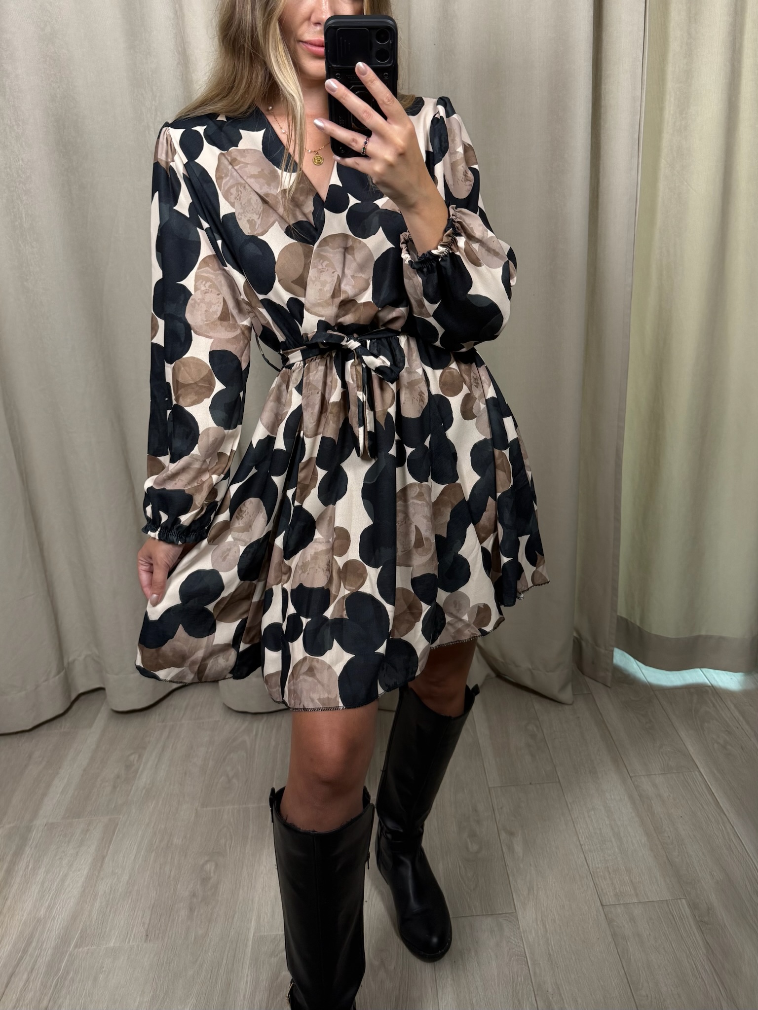 Sukienka "Impala" w kółka, to wybór na zbliżającą się jesień. Kopertowy dekolt jak i rozkloszowane biodra sprawiają, że możesz poczuć się w niej luźno i swobodnie. Natomiast gumka i pasek w talii, pozwoli Ci ją dopasować do Twojej figury.