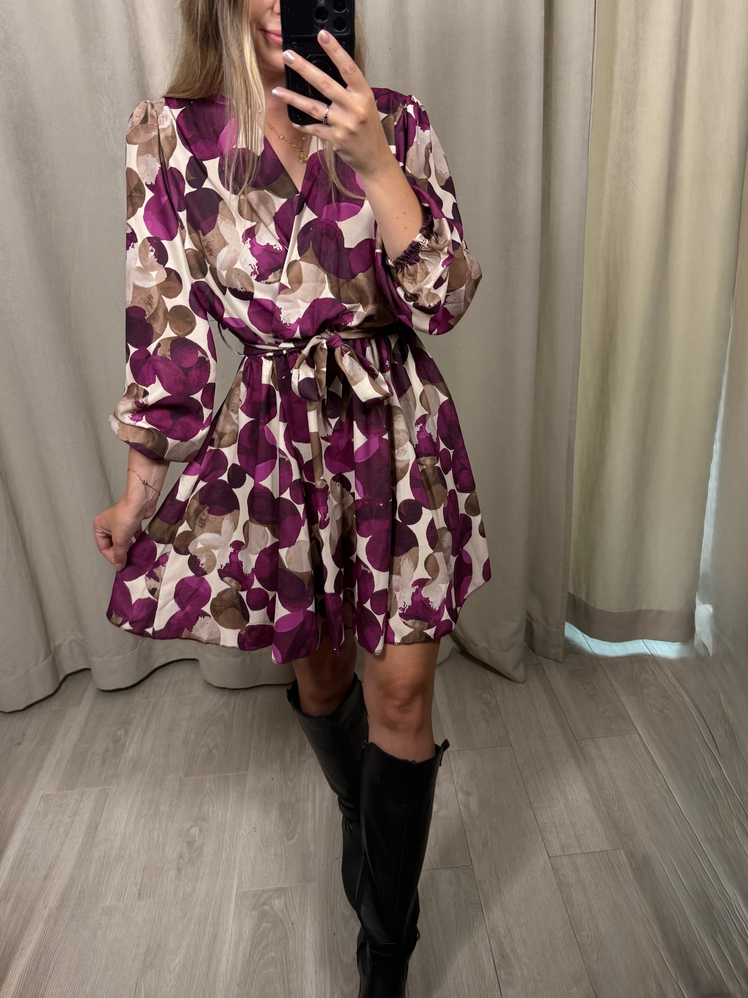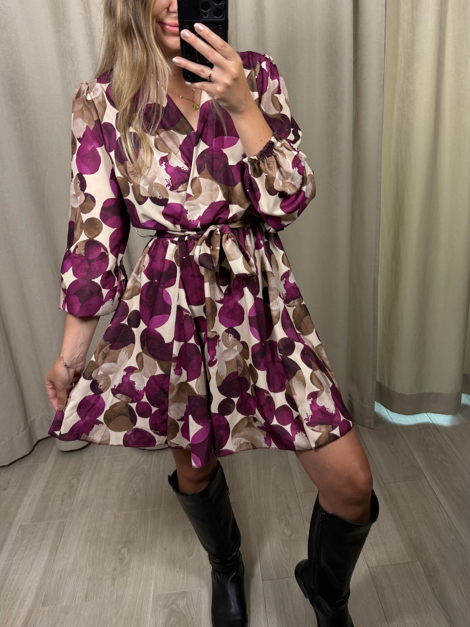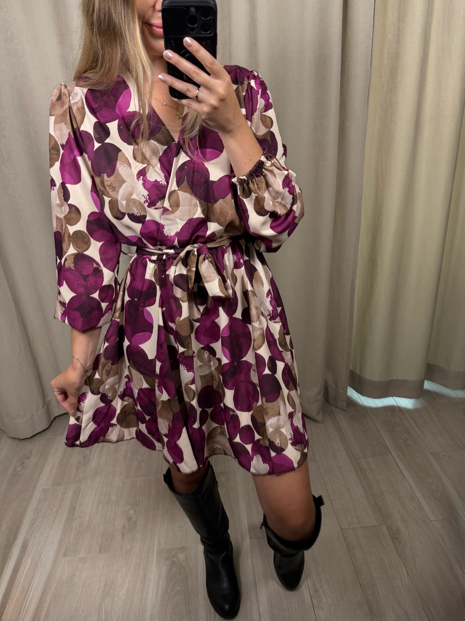 Sukienka "Impala" w kółka, to wybór na zbliżającą się jesień. Kopertowy dekolt jak i rozkloszowane biodra sprawiają, że możesz poczuć się w niej luźno i swobodnie. Natomiast gumka i pasek w talii, pozwoli Ci ją dopasować do Twojej figury.