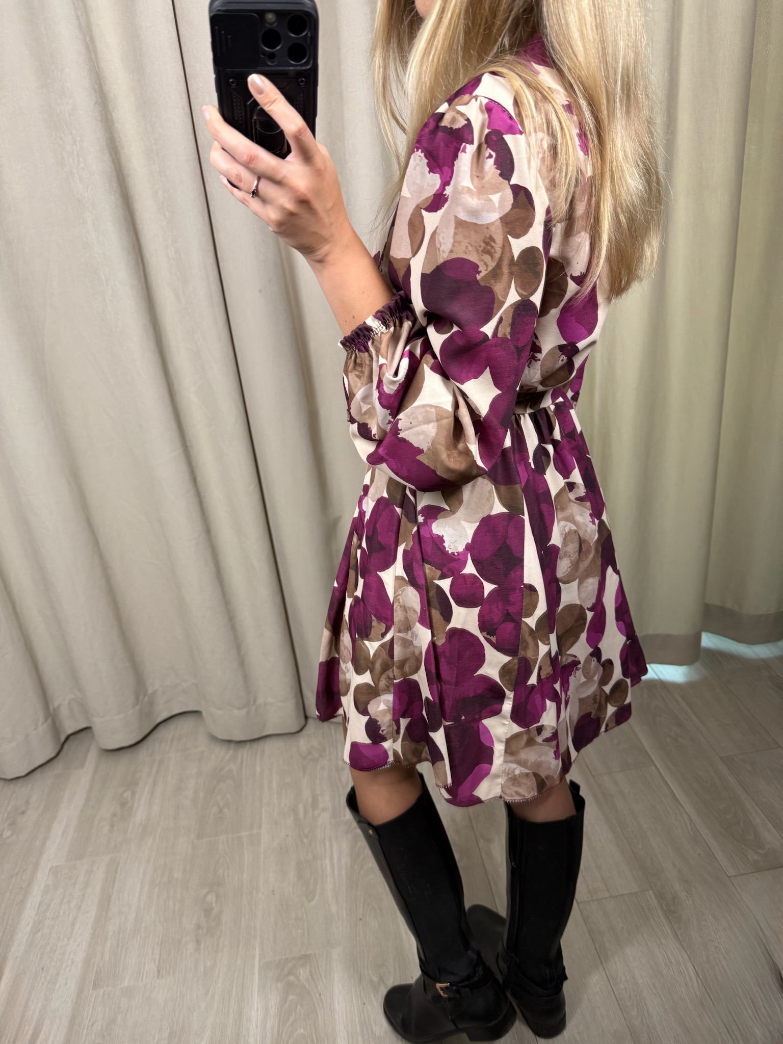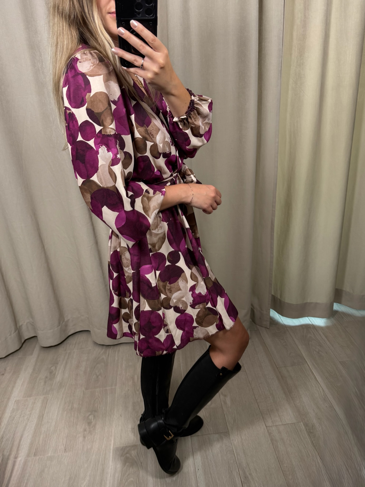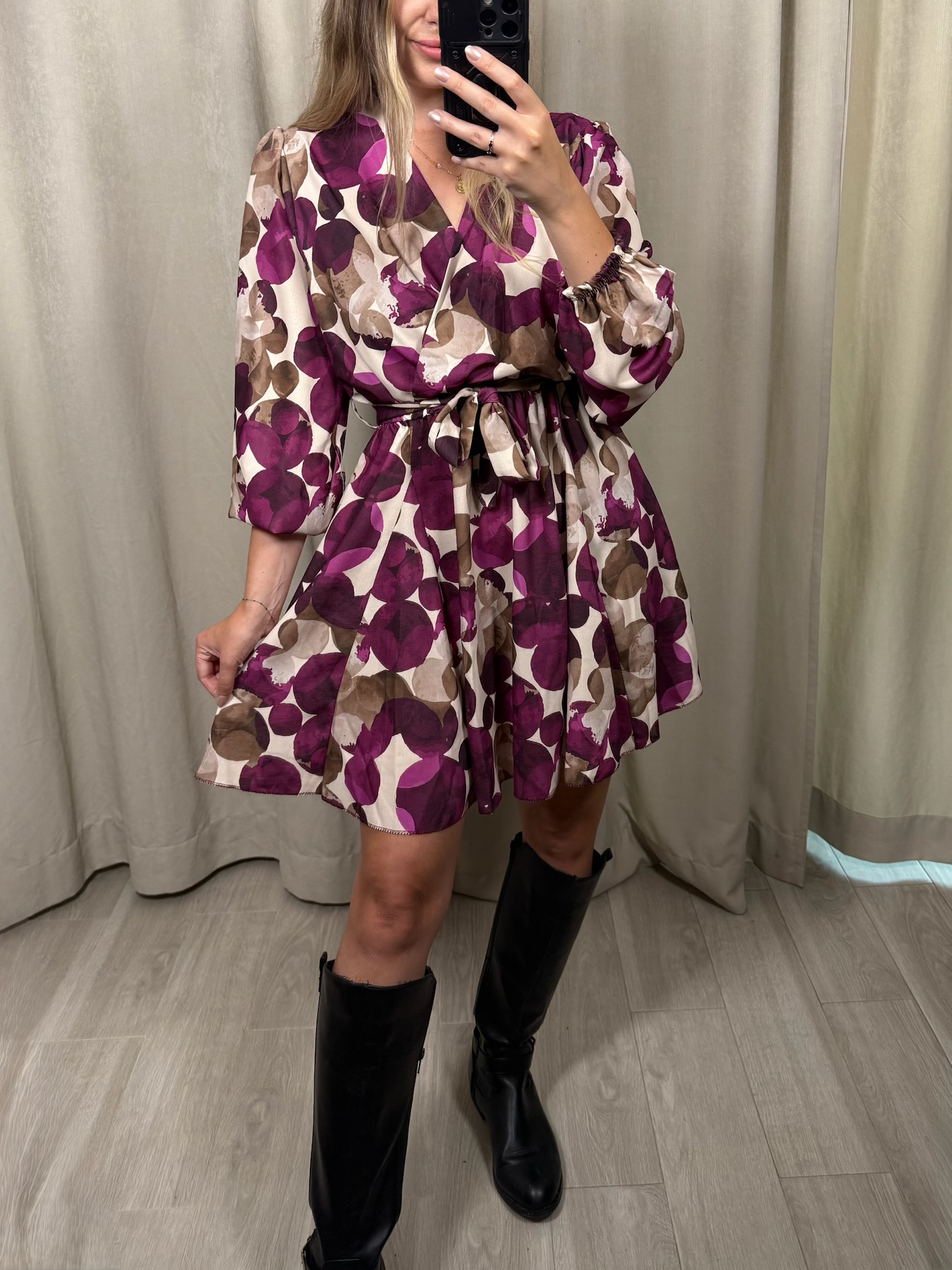 Sukienka "Impala" w kółka, to wybór na zbliżającą się jesień. Kopertowy dekolt jak i rozkloszowane biodra sprawiają, że możesz poczuć się w niej luźno i swobodnie. Natomiast gumka i pasek w talii, pozwoli Ci ją dopasować do Twojej figury.
