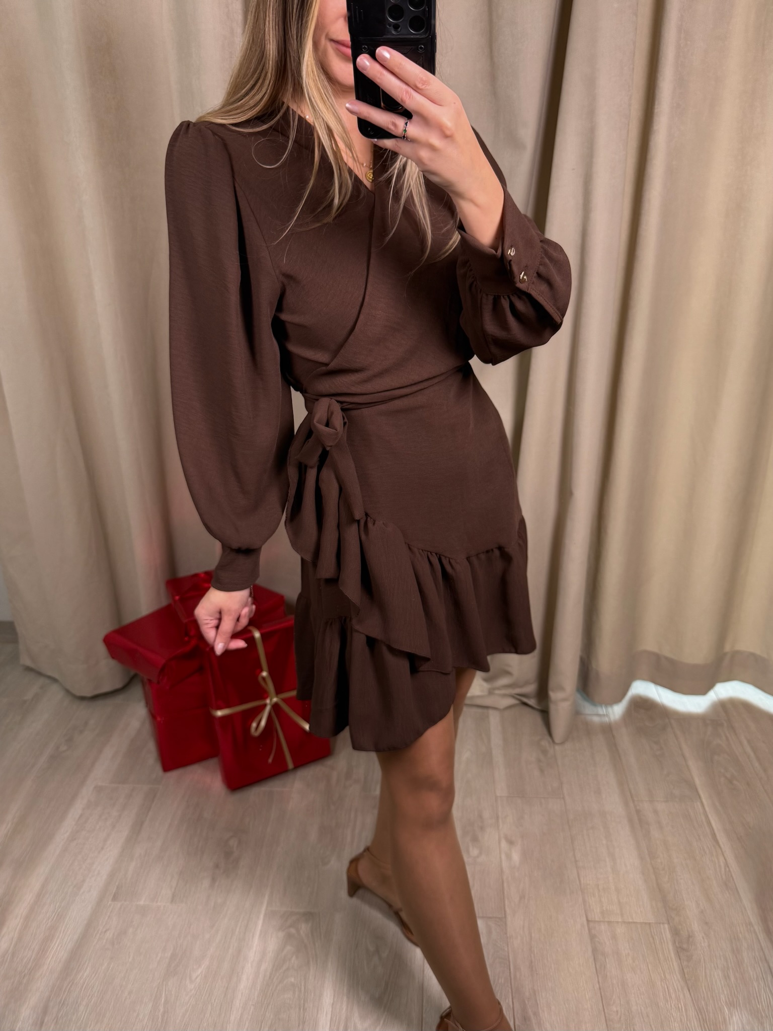 Kopertowa sukienka, która pięknie podkreśla sylwetkę i zachwyca eleganckimi detalami. Krój subtelnie eksponuje dekolt i nadaje całości kobiecego charakteru. Długie rękawy wykończone ala mankietem, zapinanym na dwa guziki, dodają sukience szyku i dopracowanego wyglądu. Dół wykończony delikatną falbaną wprowadza lekkość i romantyczny akcent. Pasek w zestawie, podkreśla talię, dzięki czemu sukienka idealnie dopasowuje się do figury. To doskonały wybór zarówno na co dzień, jak i na wyjątkowe okazje - w zależności od dodatków.