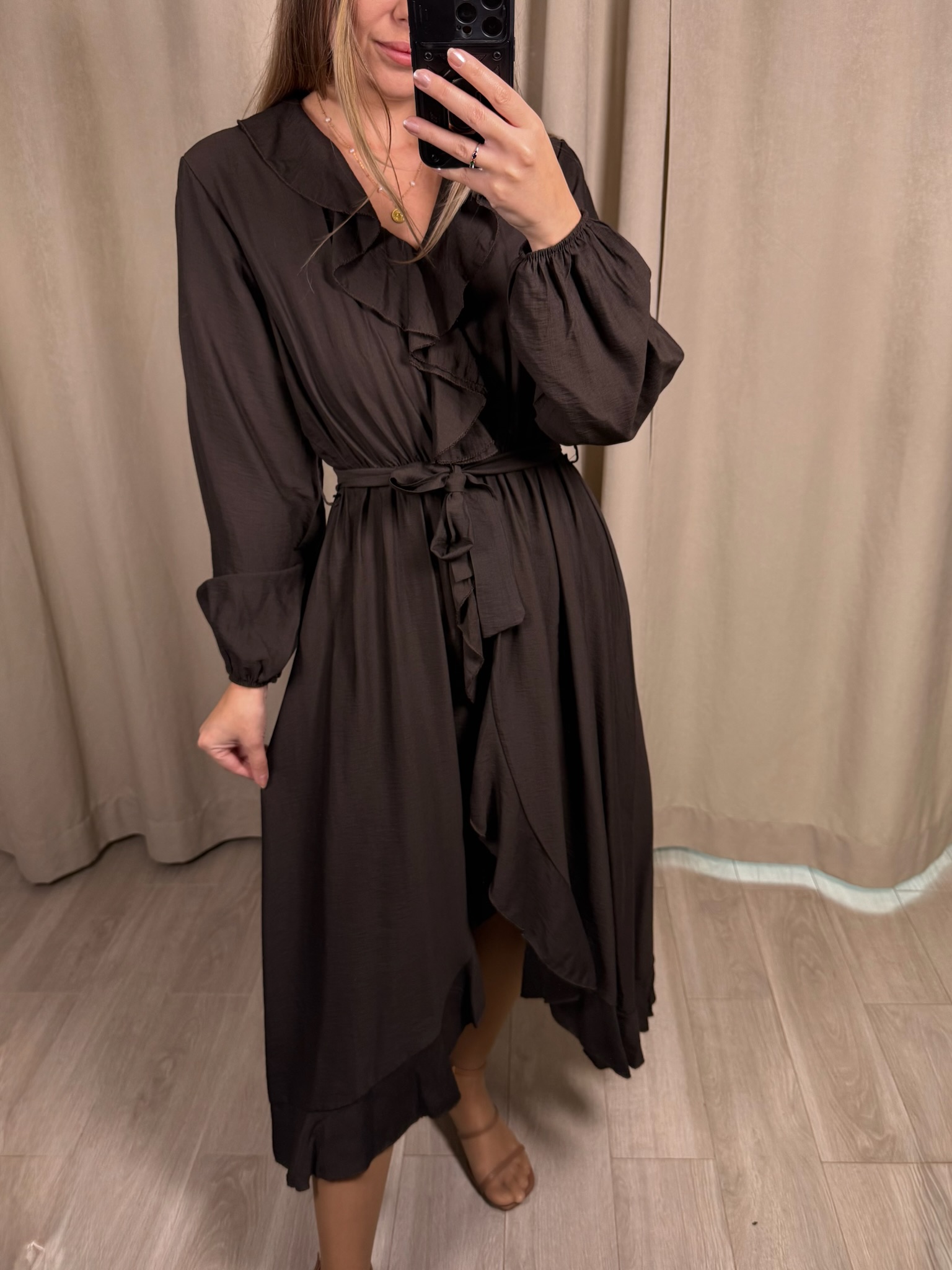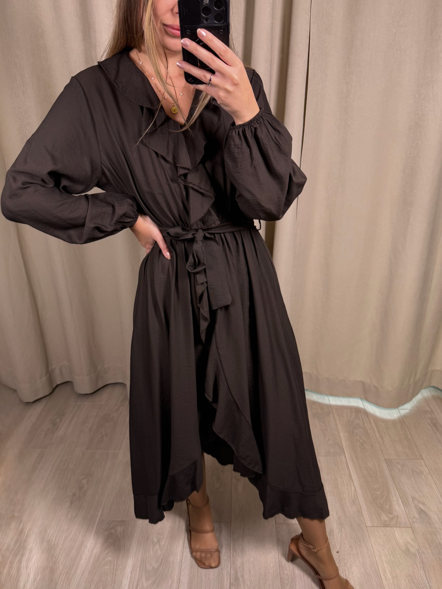 Sukienka Prima o kobiecym kroju, wykończona falbanami od dekoltu po całą długość. Ma długie rękawy zakończone elastyczną gumką. W talii wszyta gumka oraz dodatkowe wiązanie, które pozwala lepiej dopasować sukienkę do sylwetki. Dół o kopertowym, nieregulowanym kroju dodaje lekkości i swobody w ruchu. Model sprawdzi się zarówno na co dzień, jak i na specjalne okazje.