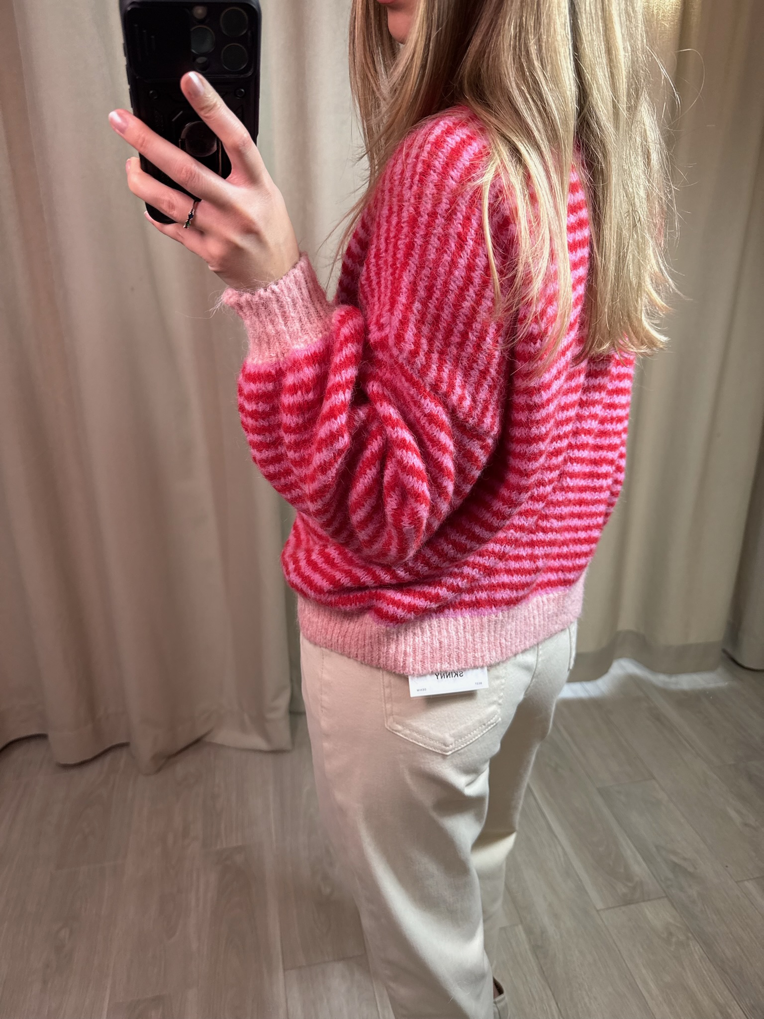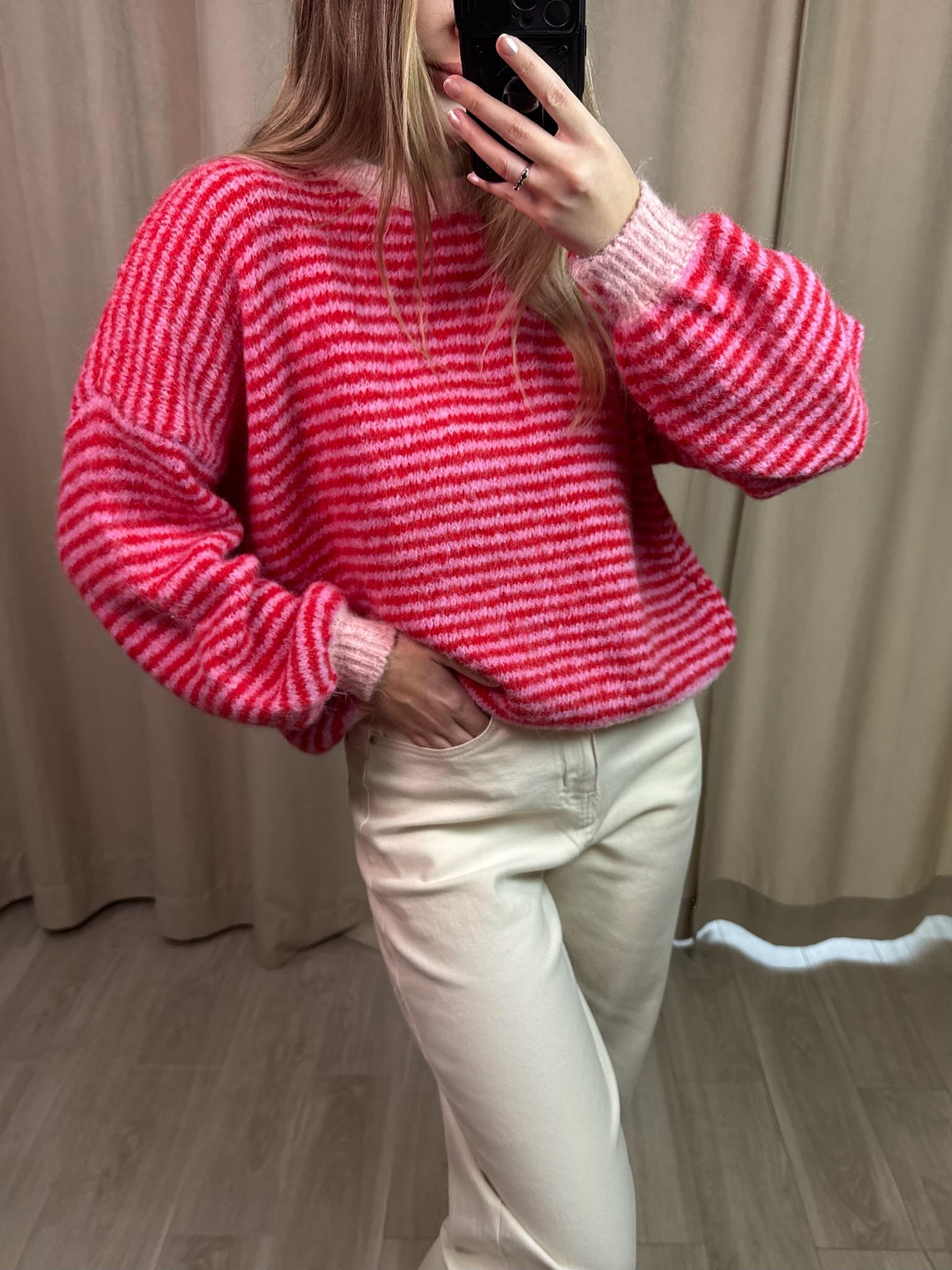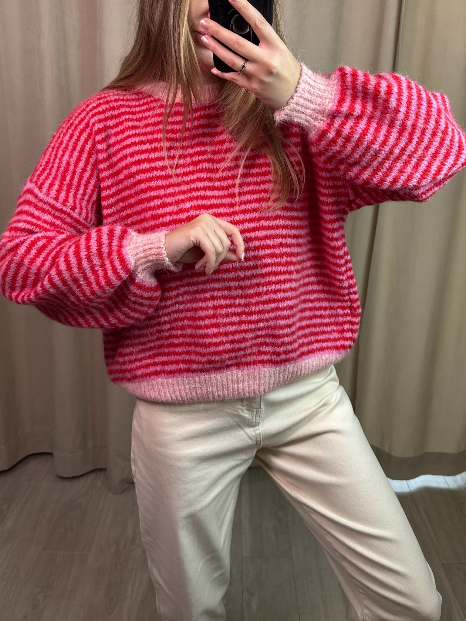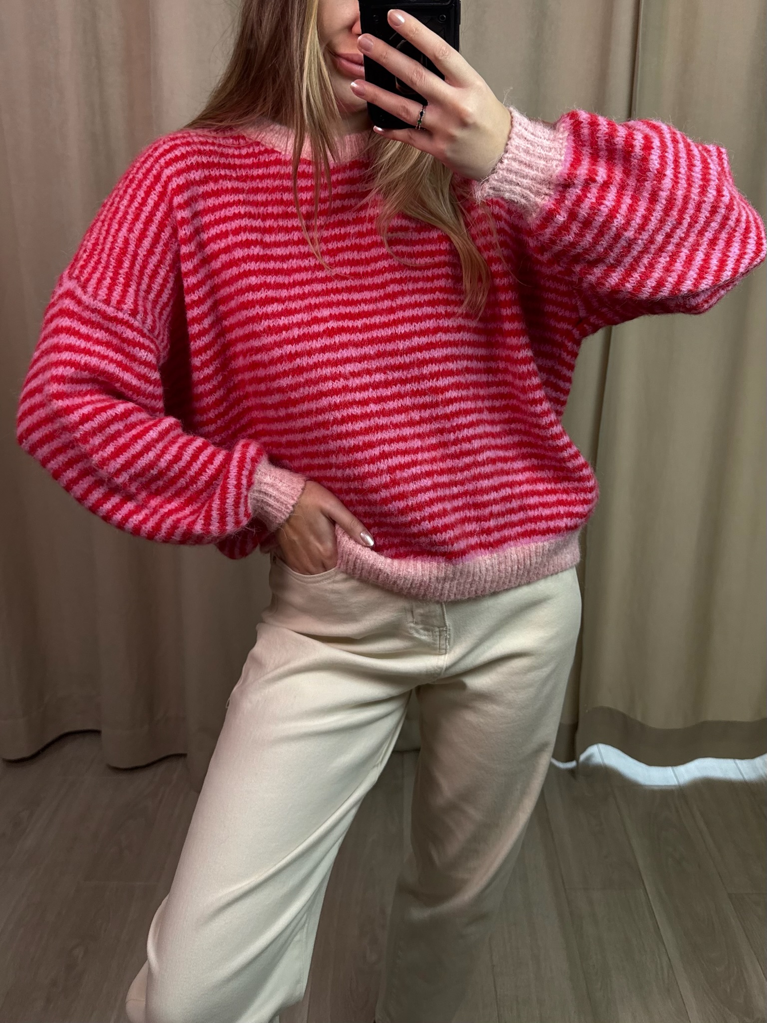 Sweter Elio. Krój oversize. Model wyróżniają delikatne różowe akcenty przy dekolcie, na zakończeniach rękawów oraz u dołu swetra, które dodają całości świeżości. Wykonany z dzianiny z domieszką wełny, zapewnia komfort i przyjemne ciepło. To wygodny, a jednocześnie wyrazisty element codziennej garderoby.