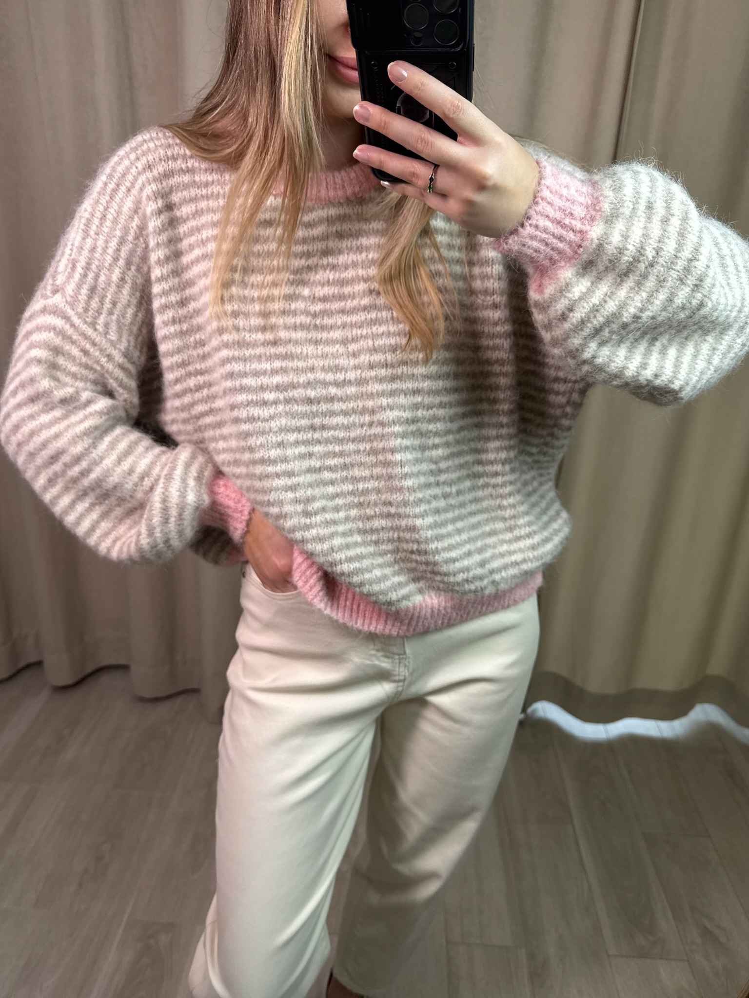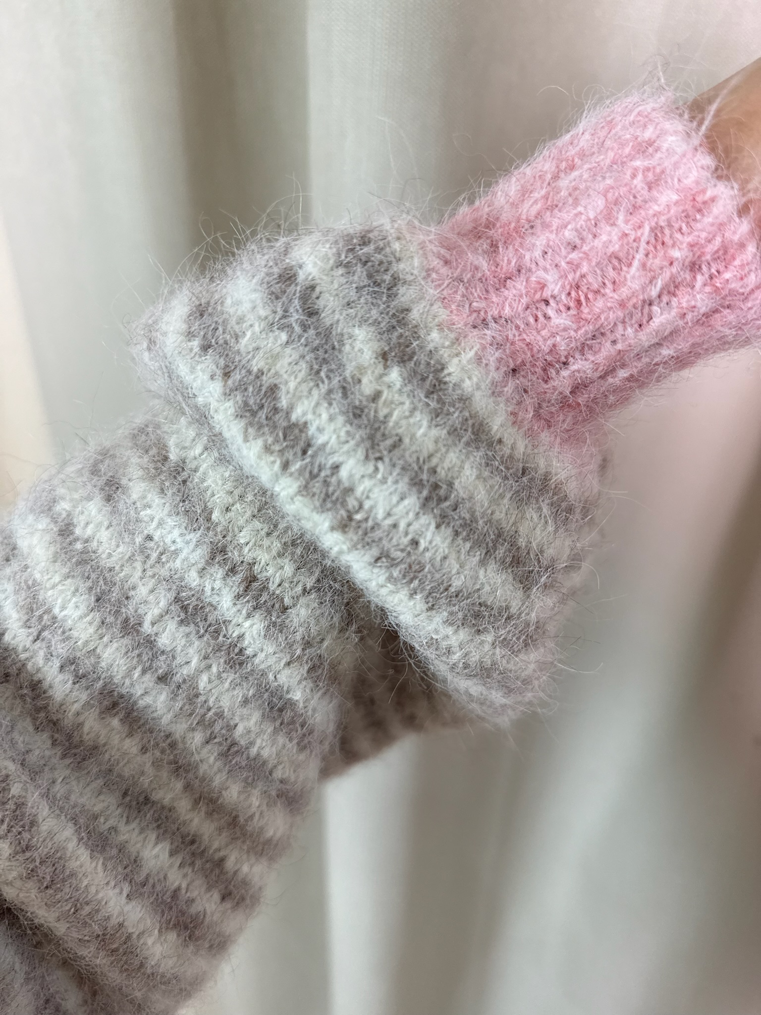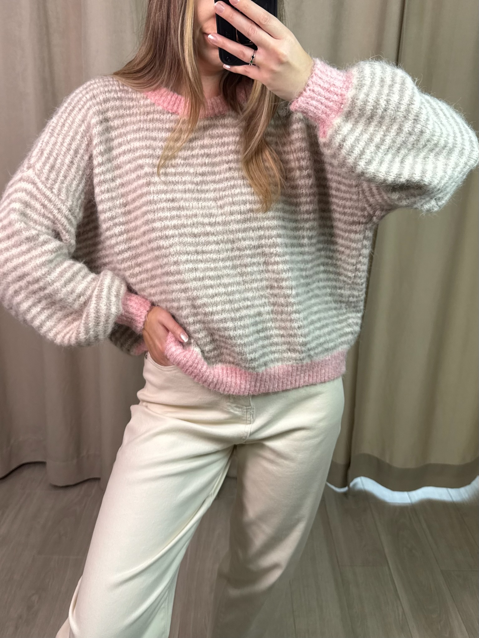 Sweter Elio. Krój oversize. Model wyróżniają delikatne różowe akcenty przy dekolcie, na zakończeniach rękawów oraz u dołu swetra, które dodają całości świeżości. Wykonany z dzianiny z domieszką wełny, zapewnia komfort i przyjemne ciepło. To wygodny, a jednocześnie wyrazisty element codziennej garderoby.