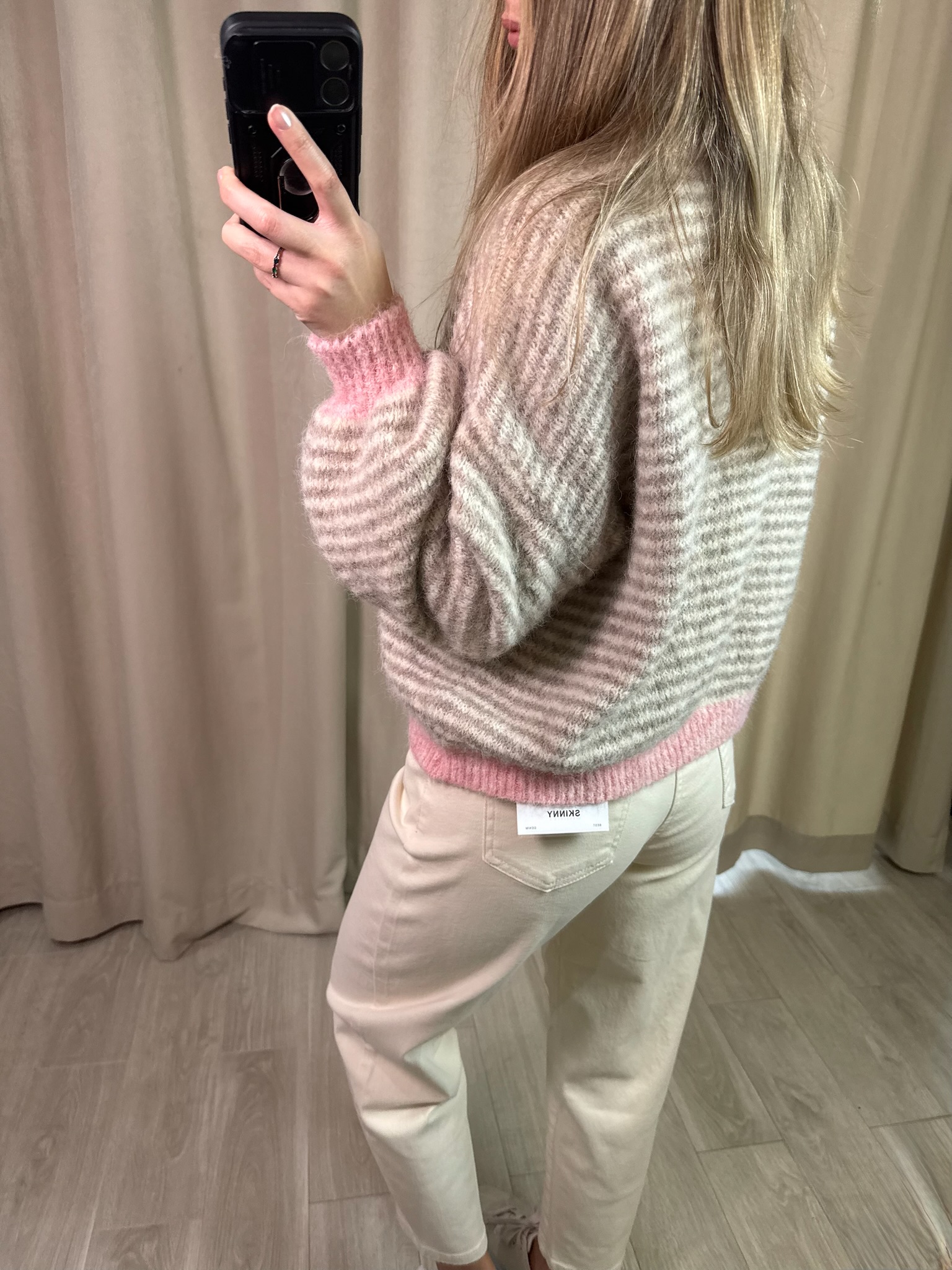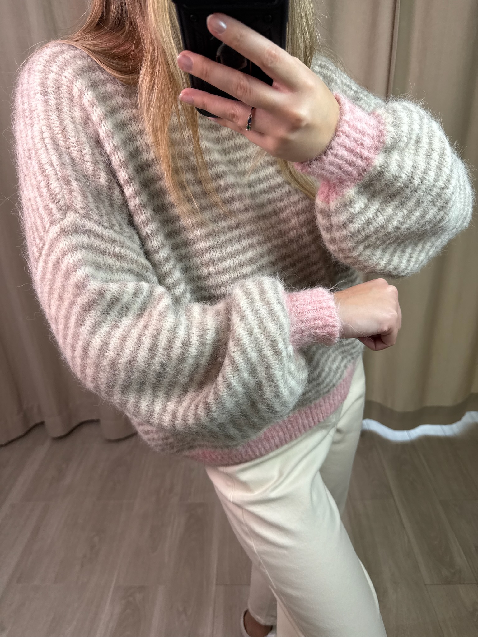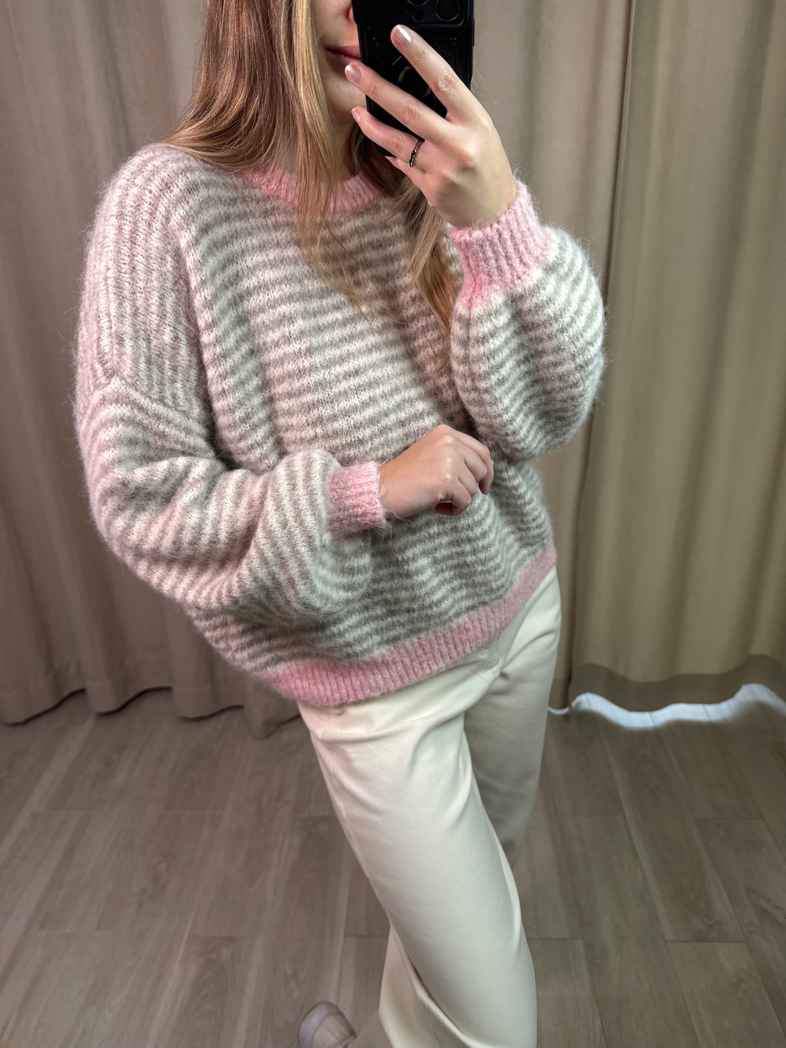 Sweter Elio. Krój oversize. Model wyróżniają delikatne różowe akcenty przy dekolcie, na zakończeniach rękawów oraz u dołu swetra, które dodają całości świeżości. Wykonany z dzianiny z domieszką wełny, zapewnia komfort i przyjemne ciepło. To wygodny, a jednocześnie wyrazisty element codziennej garderoby.
