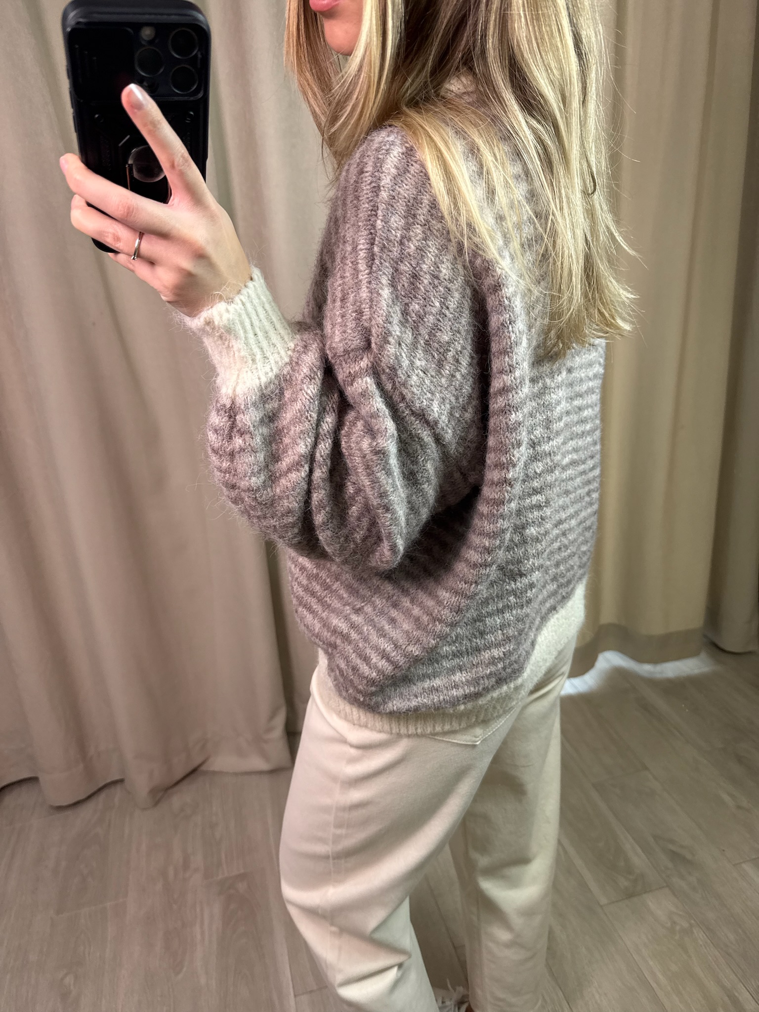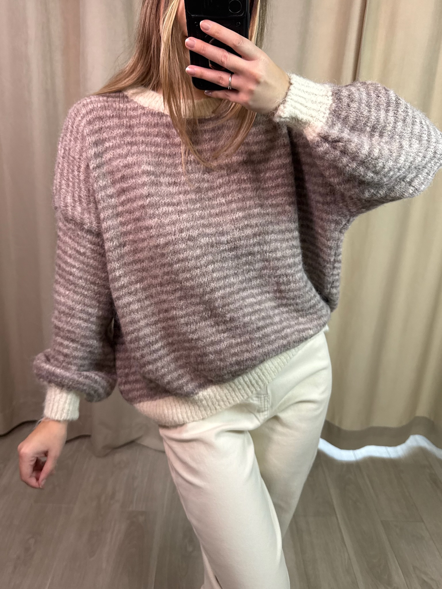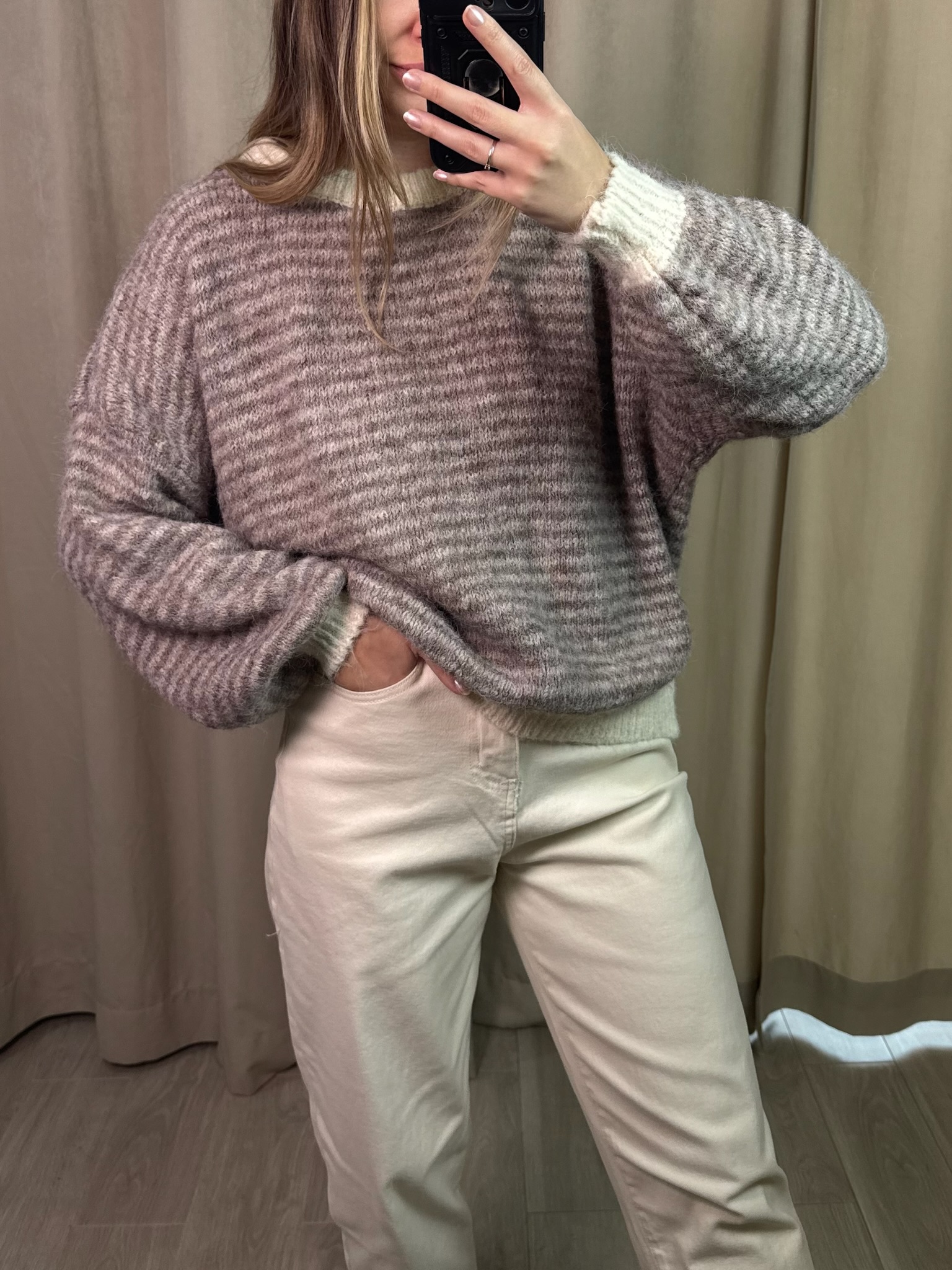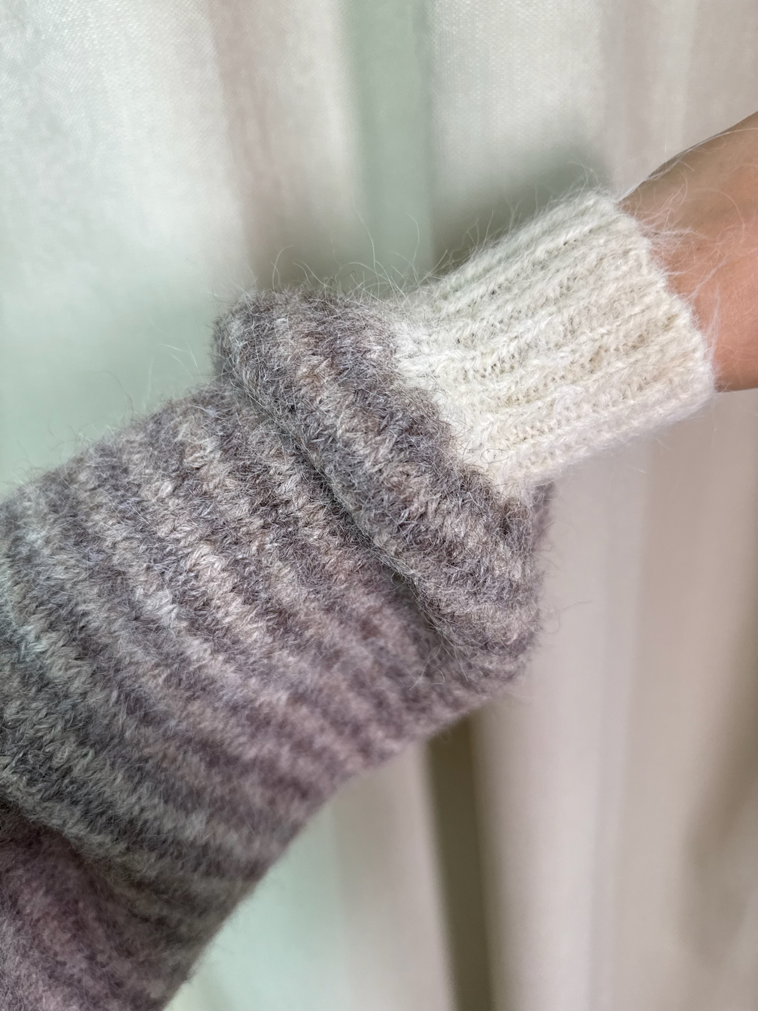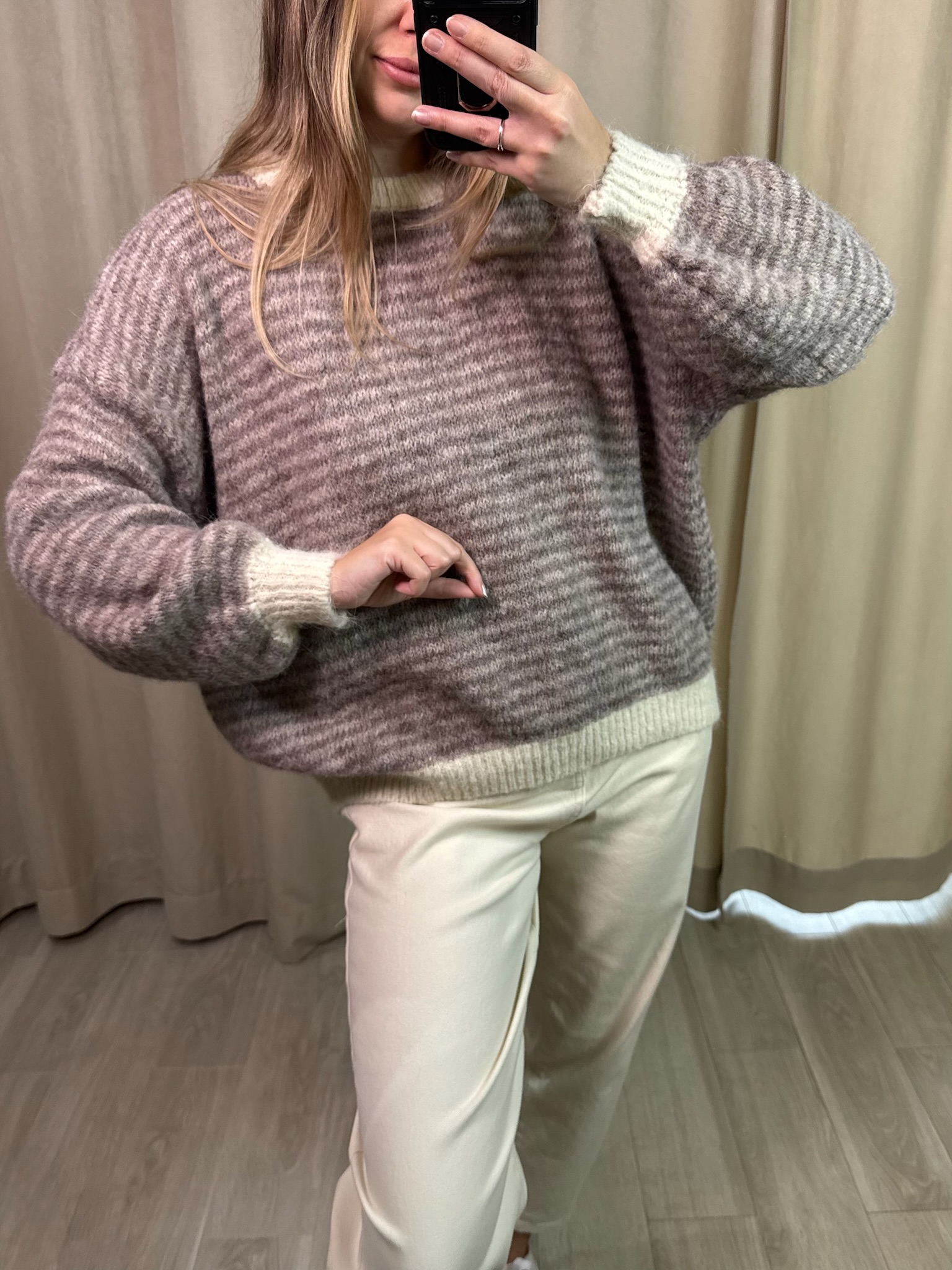 Sweter Elio. Krój oversize. Model wyróżniają delikatne kremowe akcenty przy dekolcie, na zakończeniach rękawów oraz u dołu swetra, które dodają całości świeżości. Wykonany z dzianiny z domieszką wełny, zapewnia komfort i przyjemne ciepło. To wygodny, a jednocześnie wyrazisty element codziennej garderoby.